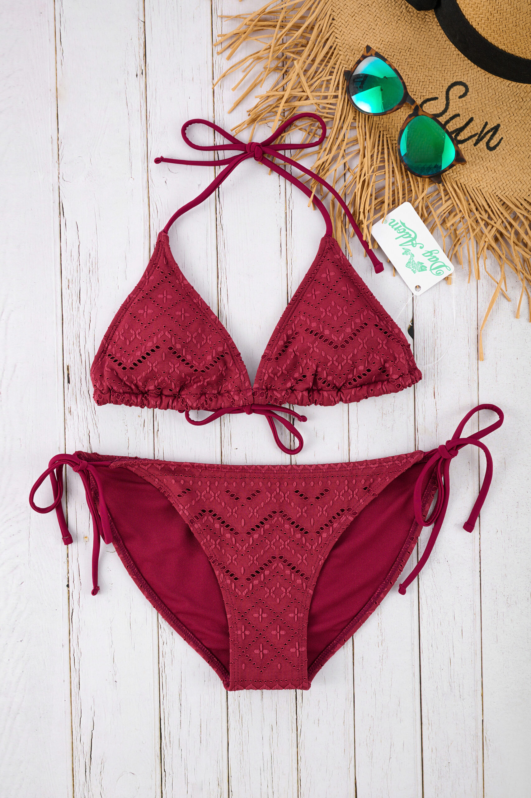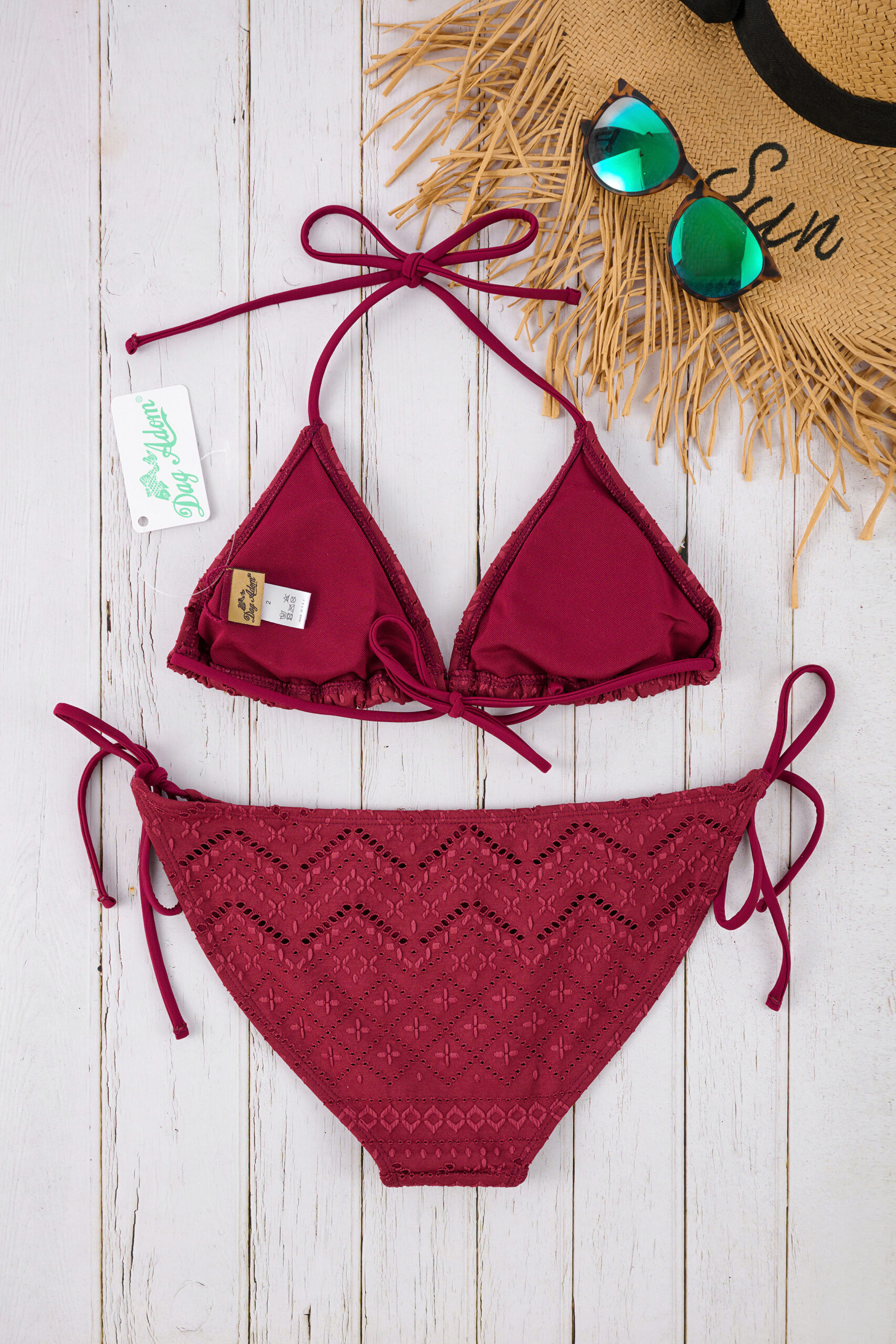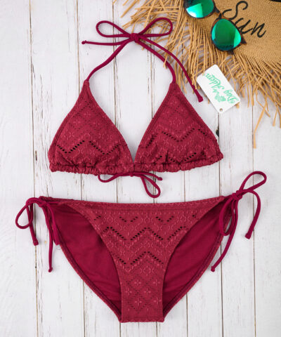 Découvrez notre maillot de bain triangle avec son tissu en broderie anglaise.