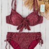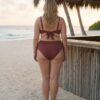 Forme bonnet D+ sans coque, avec armature, bretelles réglables et dos à nœud. Une culotte haute avec les cotés réglables. Ce produit est un incontournable pour les professionnels du maillot de bain.