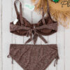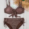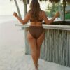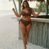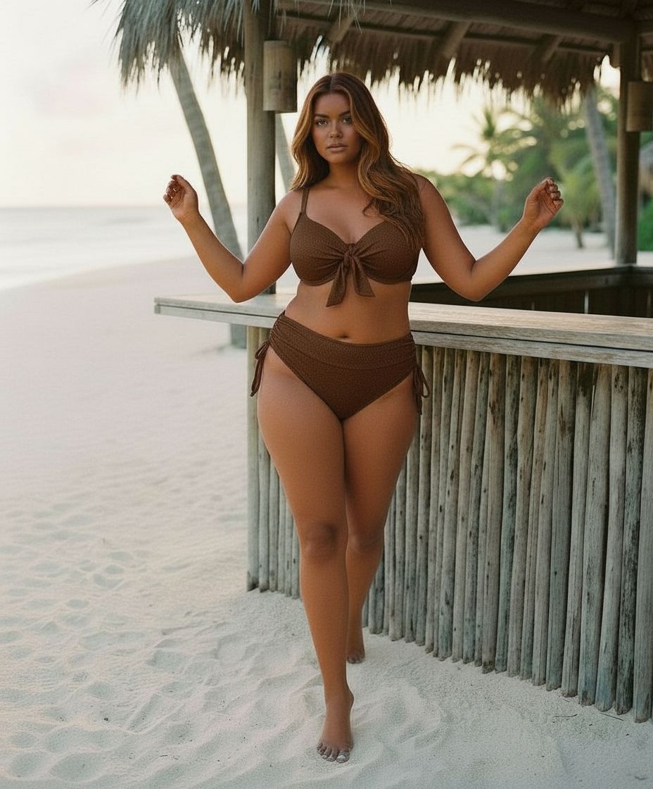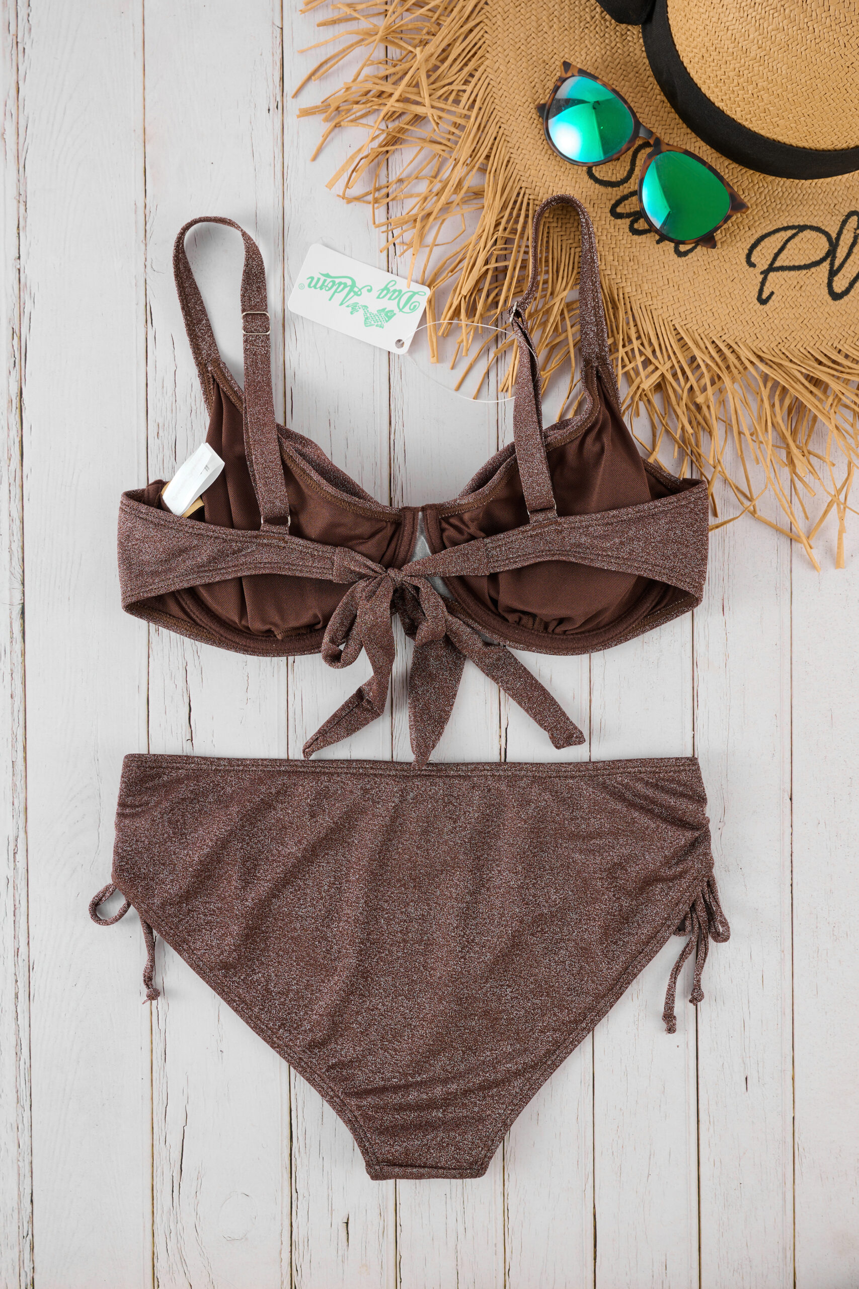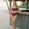 Forme bonnet D+ sans coque, avec armature, bretelles réglables et dos à nœud. Une culotte haute avec les cotés réglables. Ce produit est un incontournable pour les professionnels du maillot de bain.